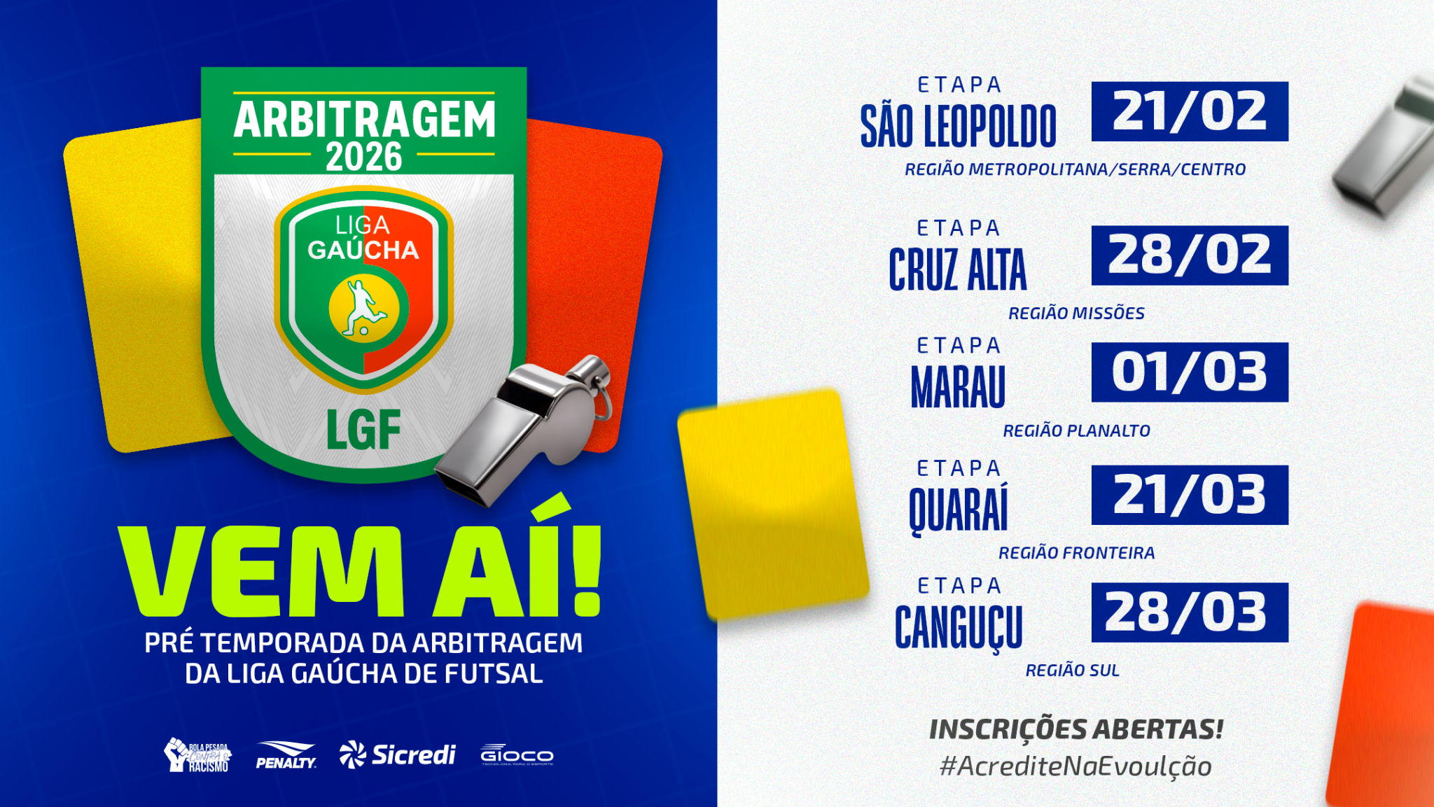 A iniciativa reforça o compromisso da Liga Gaúcha de Futsal com a qualificação técnica, a valorização da arbitragem e o desenvolvimento contínuo da modalidade no estado, mantendo o lema da campanha: #AcrediteNaEvolução.